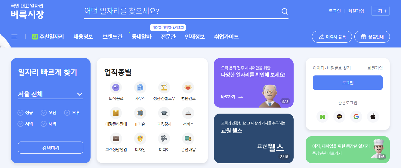 - 지역, 고용 형태(정규직·아르바이트·파트타임 등), 업종, 근무 시간대, 급여 수준 등의 조합으로 필터링해 원하는 알바나 일자리를 찾습니다.