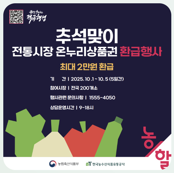 제가 사는 지역의 전통시장도 행사에 참여했는데, 일정 금액 이상 구매 후 영수증을 제시하면 온누리상품권으로 일부 금액을 환급받을 수 있었습니다. 현장에서 현금처럼 쓸 수 있어서 매우 유용했습니다.