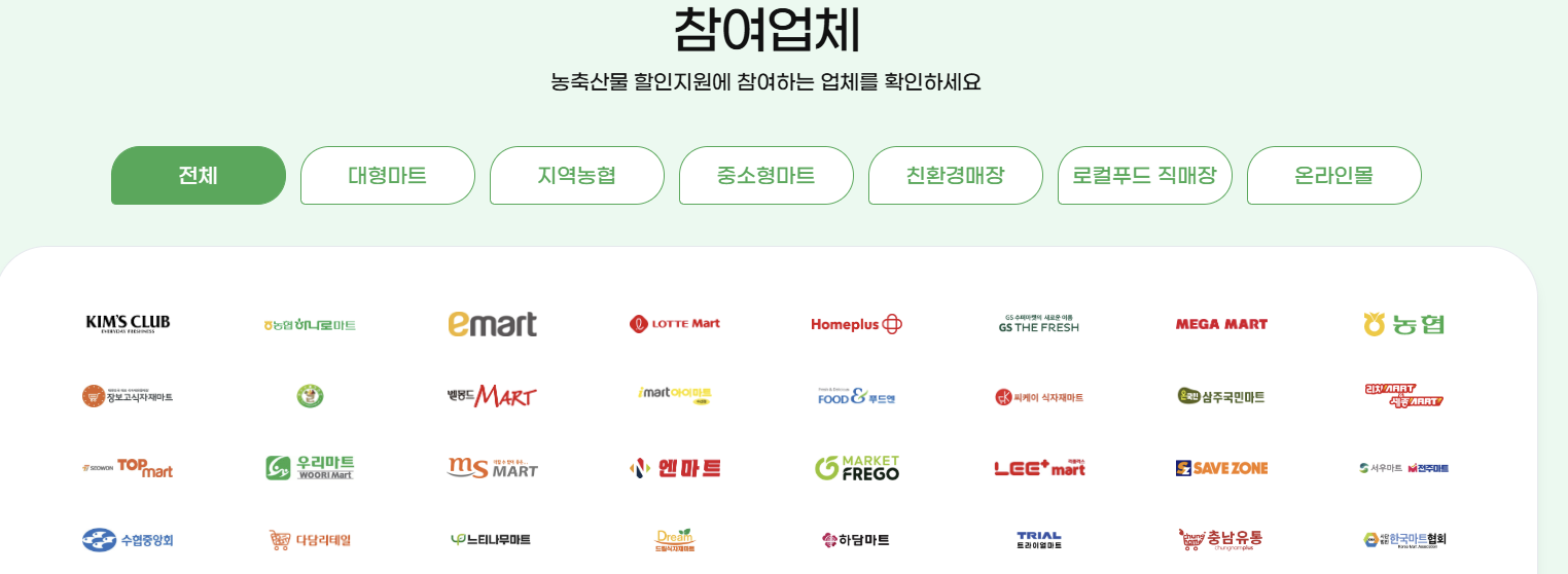 할인지원 사업에는 대형마트, 중소형마트, 농협, 친환경 매장, 로컬푸드 직매장, 온라인몰 등 다양한 업체가 참여합니다. 전통시장도 빠지지 않고 포함되어 있습니다.