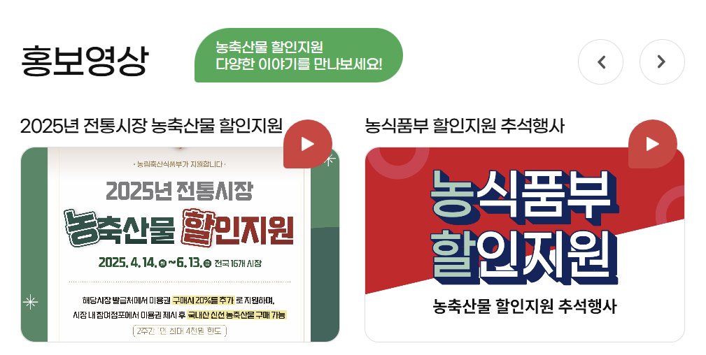 농축산물 할인지원 누리집은 농림축산식품부와 한국농수산식품유통공사가 운영하는 공식 사이트입니다. 소비자 입장에서는 할인 품목, 행사 일정, 참여 업체를 확인할 수 있고, 유통업체나 전통시장 입장에서는 참여 신청과 관리가 가능합니다.