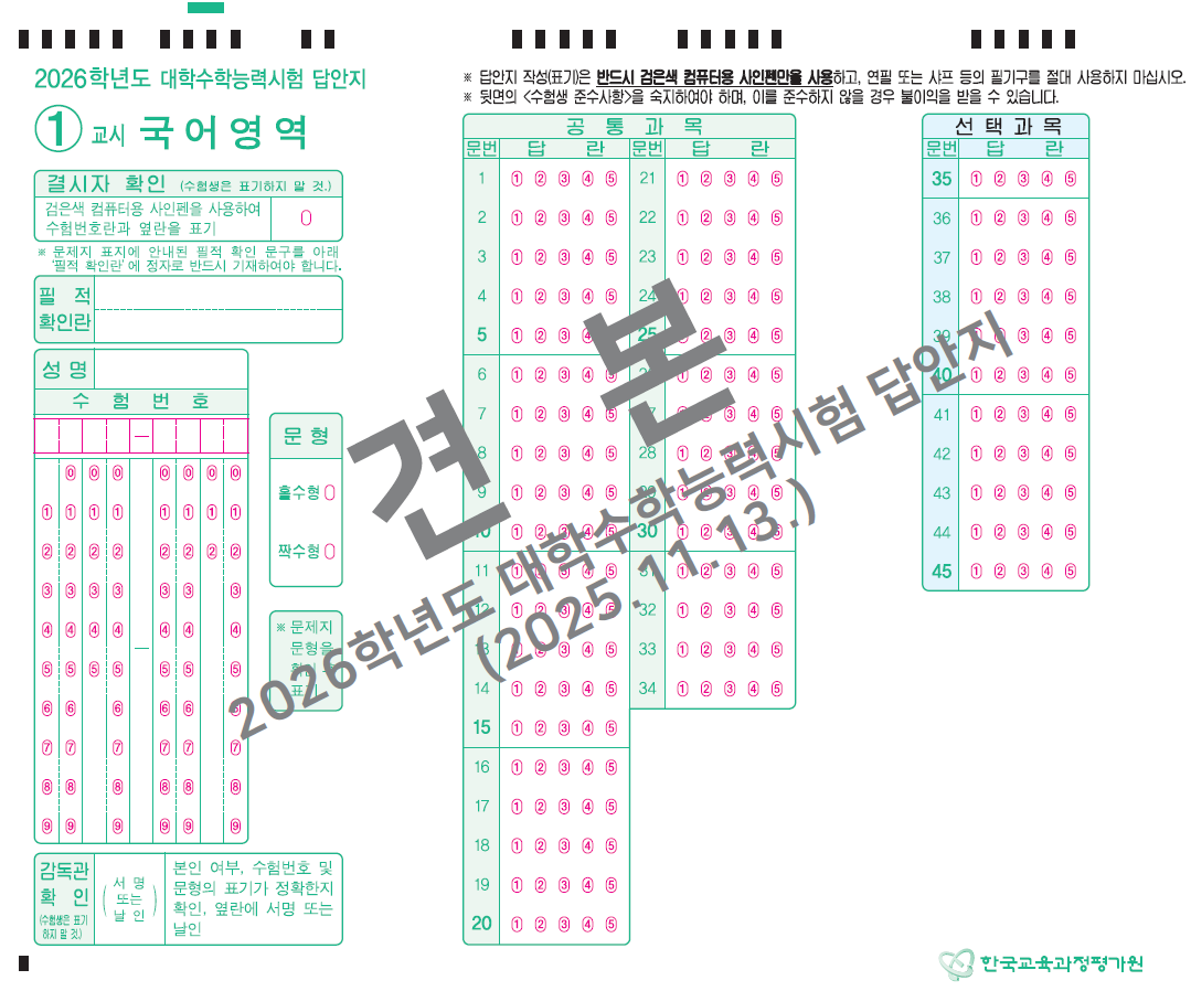 - 한국사 영역은 필수 응시로, 40점 미만일 경우 수능 응시 자체가 무효 처리됩니다.