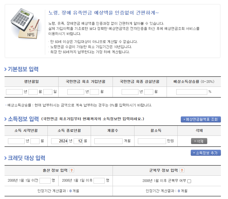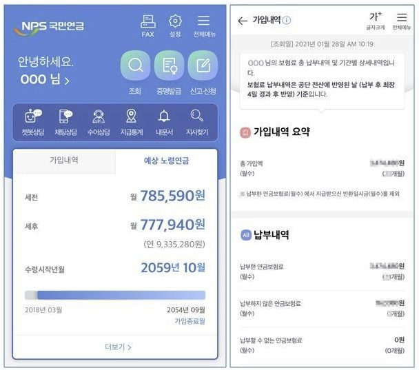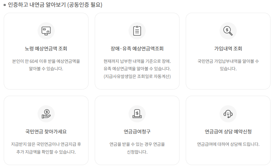 - 정보 확인: 가입 기간, 납부 내역 등을 확인하고 예상 연금액을 조회합니다.