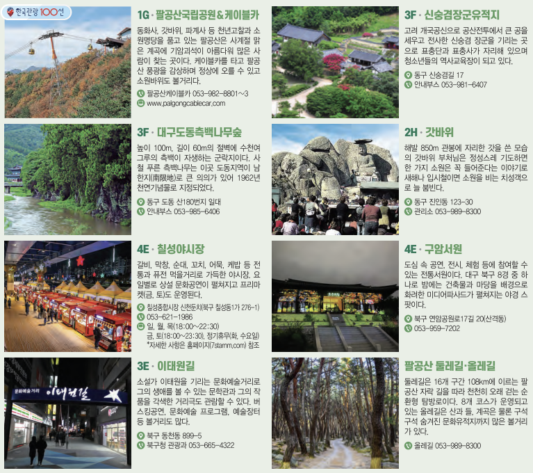 - 주요 볼거리: 동화사(사찰), 갓바위, 팔공산 케이블카 등.