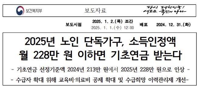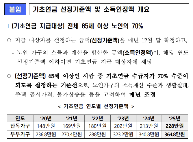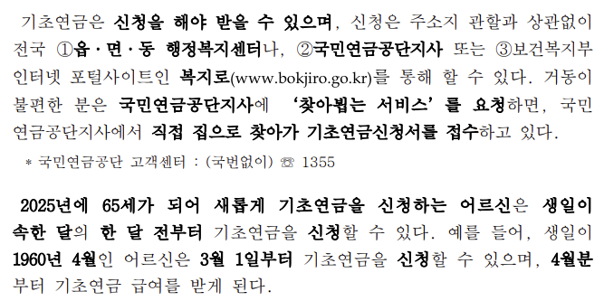 - 1960년생 어르신 추가: 2025년부터 만 65세가 되는 1960년생 어르신들이 새롭게 기초연금을 신청할 수 있습니다.